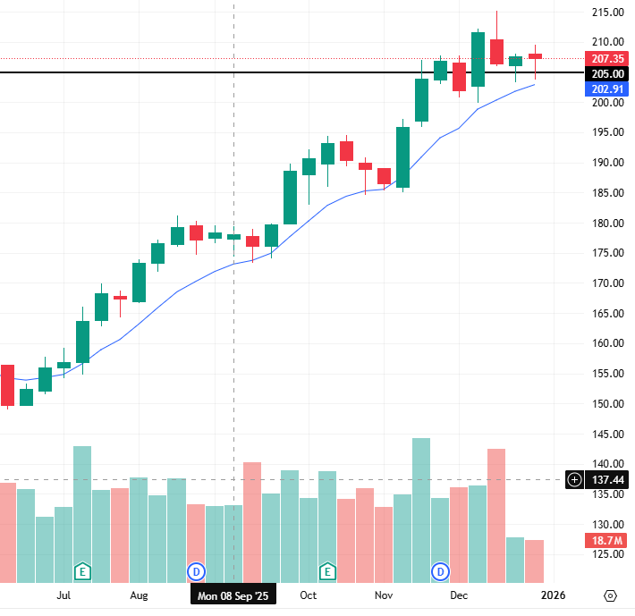 Pullback from $215.19 High: Price pulled back from the $215.19 high, providing a favorable re-entry opportunity within the broader uptrend rather than a late-stage breakout chase.